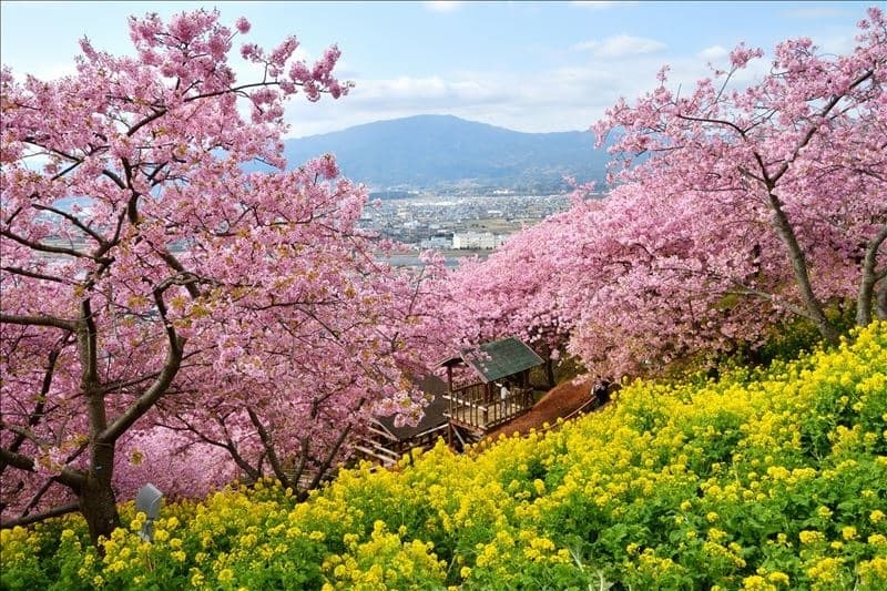 The festival features stunning pink Kawazu cherry blossoms contrasted against bright yellow canola flowers. On a clear day, you can also enjoy breathtaking views of Mount Fuji, beautifully framed by the cherry blossoms.